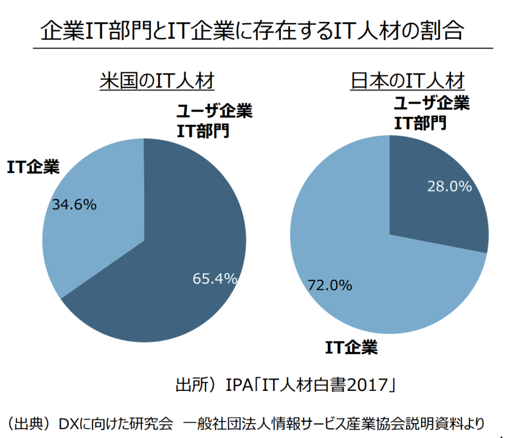 一方で日本のIT人材は、そういったユーザー会社のIT部門に所属しているのは約4分の1(28%)に過ぎず、大半がIT企業、つまりはSI会社やソフトウェア開発会社など、外部の会社に対して開発役務を提供する会社に所属しています。
