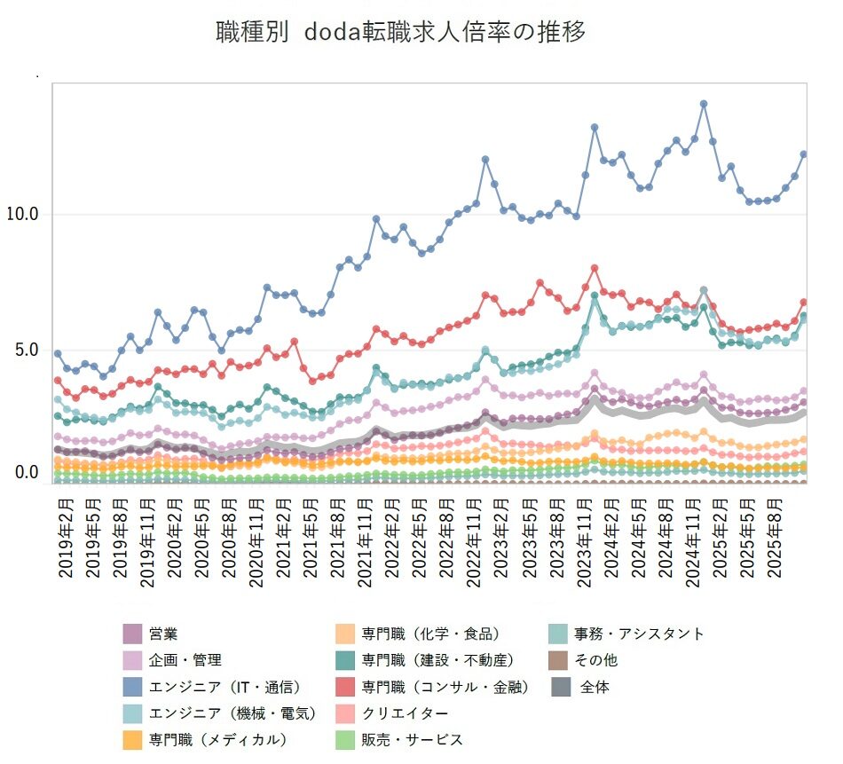 2025年12月18日に発表された求人情報・転職サイトdodaによる「転職求人倍率レポート(2025年11月)【最新版】」によると職種別の転職求人倍率データにおいて「エンジニア(IT・通信)」は、12.8倍となっており、1人の求職者に対して12.8の求人がある計算です。