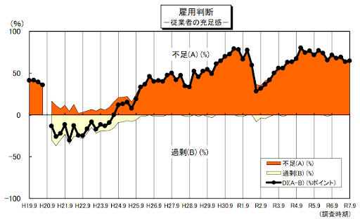 一般社団法人 情報サービス産業協会(JISA)が、2025年11月4日に発表した「JISA-DI調査(令和7年9月期)結果」をみると、雇用判断(従業員の充足感)は、2012年(平成24年9月)頃より不足と答えた会社が、過剰と答えた会社を常に上回っています。